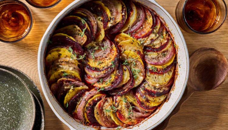 Layers of butternut squash, red onion, potato and beets combine to create this stunning casserole. A quick garlic-infused oil is brushed onto the vegetables to get savory flavor in every bite.
