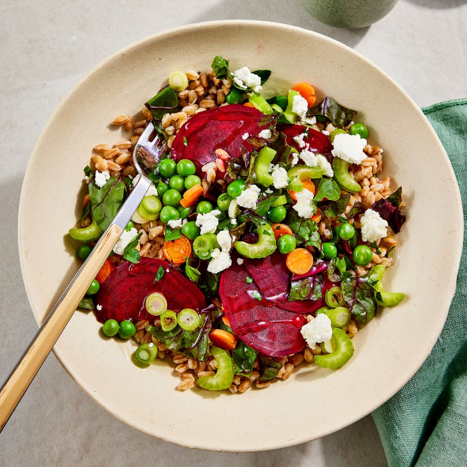Farro provides satisfying chew, while the raw shaved veggies soften slightly in the vinaigrette to become perfectly tender-crisp. To blanch the peas, cook in boiling water for 1 minute, then dunk in an ice bath for 1 minute to stop the cooking. A mandoline or vegetable peeler makes quick work of thinly slicing vegetables. Beets contain a phytochemical called betalains, which can help fight inflammation in the body.