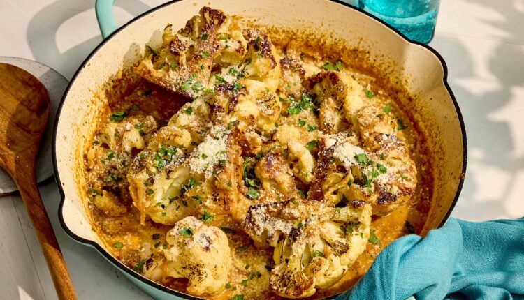 This garlic-Parmesan melting cauliflower turns a simple head of cauliflower into a stunning side dish. Searing the wedges creates deep golden flavor, while a garlicky Parmesan sauce bakes into every crevice for a tender, spoon-soft texture. It’s an easy yet impressive side that feels right at home on both weeknights and special occasions. Look for Parmesan cheese labeled vegetarian if you avoid cheese made with animal rennet.