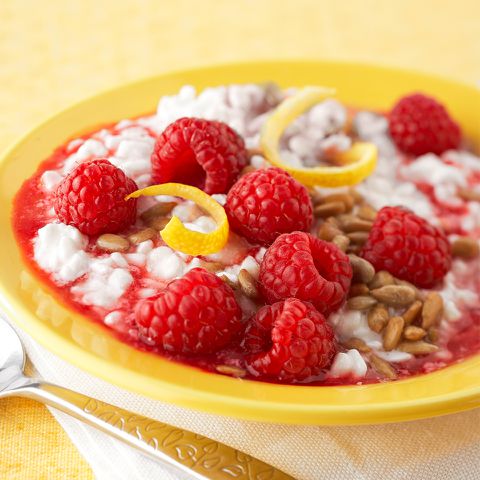 Crunchy sunflower seeds add delicious flavor to this simple, light meal or snack of cottage cheese dressed up with raspberries and honey.