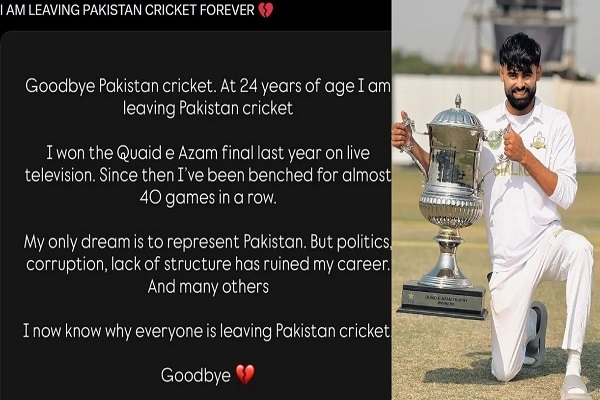 “Goodbye Pakistan cricket. At the age of 24, I am leaving Pakistan cricket. I won the Quaid-e-Azam Trophy final last year on live television. Since then I have been benched continuously for almost 40 games. My only dream was to represent Pakistan, but politics, corruption and lack of structure ruined my career. Now I know why everyone is leaving Pakistan cricket.”