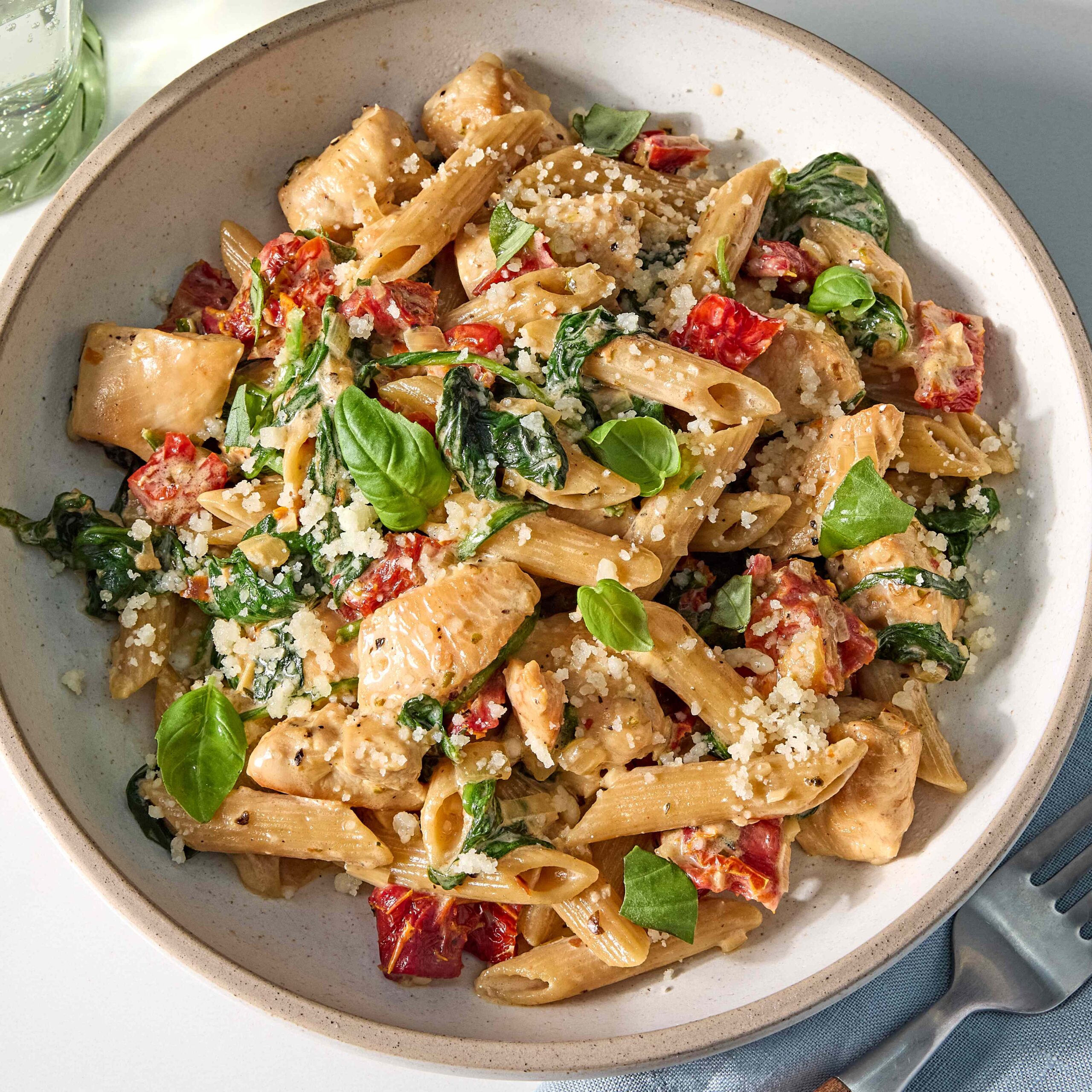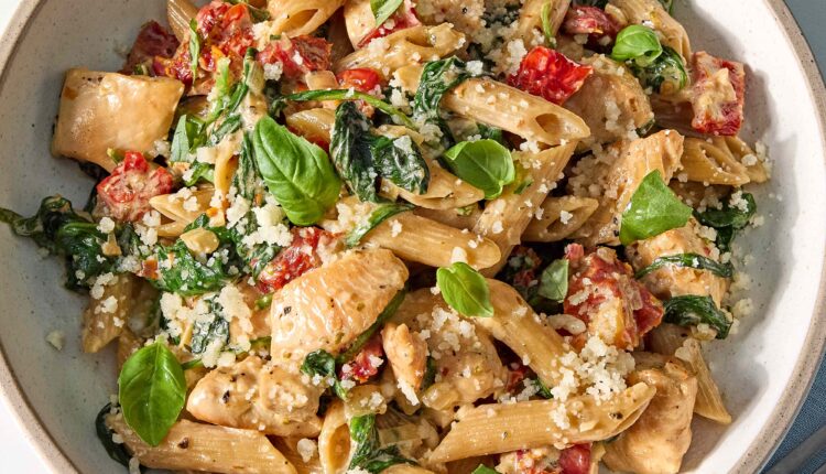 This easy “marry-me” dinner combines tender chicken, sun-dried tomatoes and whole-wheat pasta in a creamy, Parmesan-infused sauce. Fresh spinach and basil brighten the rich flavors, making this comforting meal weeknight-friendly yet special enough for company.