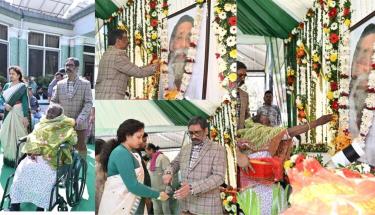 Ranchi: On the occasion of the 82nd birth anniversary of Dishom Guru Shibu Soren, the leader of the Jharkhand movement, pride of the tribal society, former Chief Minister of the state and founder of Jharkhand Mukti Morcha, tributes were paid to him at the residence of late Guruji in Morhabadi, Ranchi on Sunday. On this occasion, Chief Minister Hemant Soren, his mother Rupi Soren and wife Kalpana Soren along with many family members paid tribute to Guruji by offering flowers on his picture.
