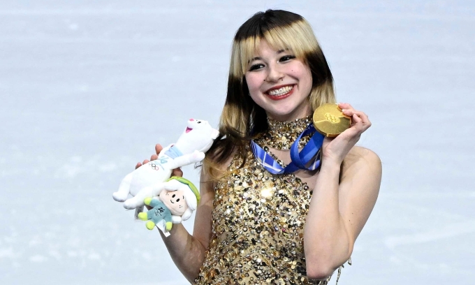 Alysa Liu poses with the gold medal following her victory of the figure skating women’s singles at the 2026 Winter Olympics. Photo by AFP