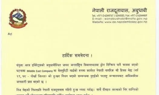 According to the Nepali Embassy, 29-year-old Shrestha, a resident of Gorkha, was working as a security guard in a Middle East company. Nepalese national Shrestha died while neutralizing a drone at Zayed International Airport in Abu Dhabi, the capital of the United Arab Emirates.