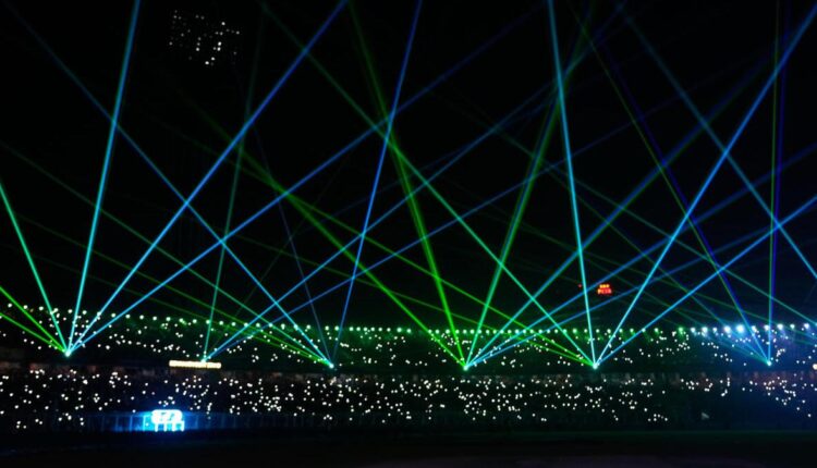 India was 53 for two in pursuit of 196 when the PowerPlay ended, and the scheduled break was taken. During the three-minute interval, the stadium lights were dimmed and a laser show was conducted, briefly plunging the ground into darkness.