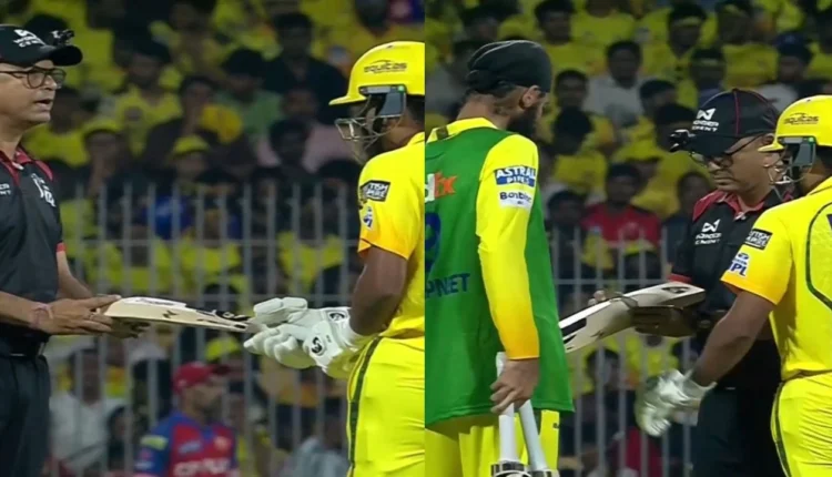 A substitute ran on with a second bat. That one did not pass through the gauge either. Then a third bat was brought out. Same result. By this point Mhatre was visibly flustered, standing at the crease looking thoroughly confused while the Chepauk crowd tried to make sense of what was happening.