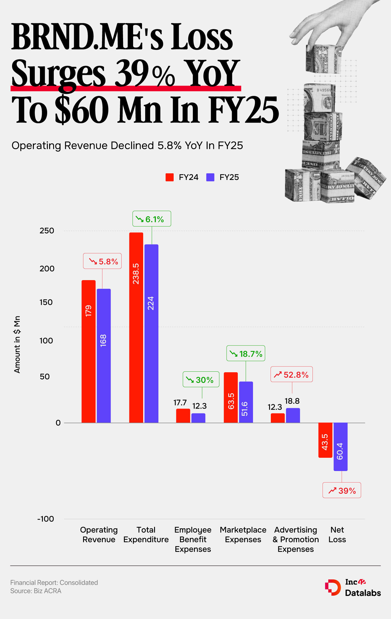 According to BRND.ME’s financial filing in Singapore, the startup saw a 5.8% decline in its consolidated revenue from operations to $168 Mn (about ₹1,394 Cr) in FY25 from $178.6 Mn (about ₹1,482 Cr) in the previous fiscal year. Meanwhile, its loss widened 39% YoY to $60.4 Mn (about ₹501 Cr) from $43.5 Mn (about ₹361 Cr) in FY24.