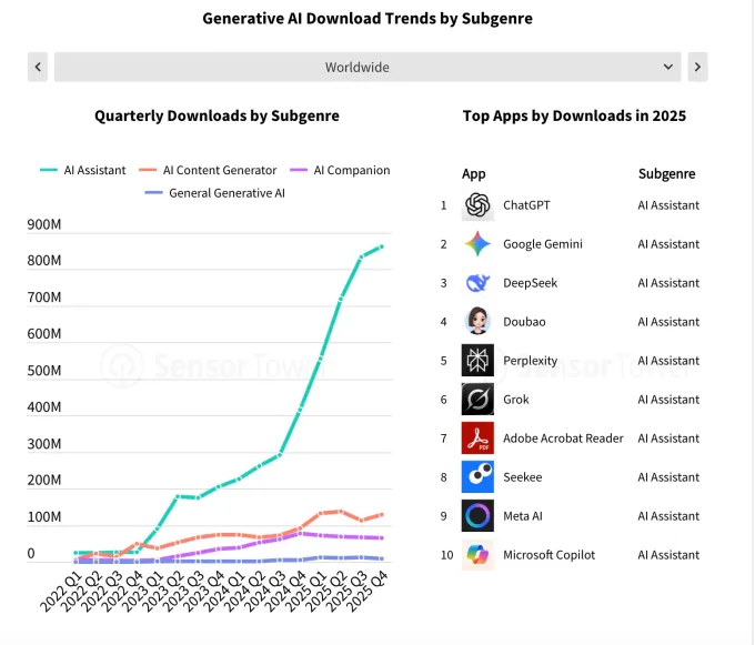 The report also highlighted the role that mobile plays in connecting users to generative AI services. Sensor Tower estimates that the total audience for AI assistants topped 200 million in the U.S. by year-end, and more than half (110M) were accessing the assistants exclusively on mobile devices. In 2024, for comparison, only around 13 million users were mobile-only.