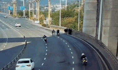 Video footage circulating on Chinese social media showed the bike drifting out of the rightmost lane, crossing the solid white line, and plowing into a group of people walking along the guardrail. Several were knocked to the ground.
