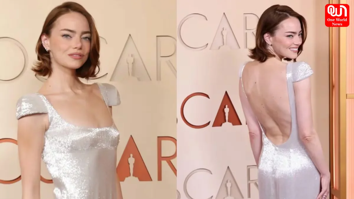 At the Oscars 2026, Emma Stone chose a custom Louis Vuitton Couture gown that radiated sophistication. The shimmering dress featured intricate beadwork and a soft pearlescent finish that reflected light beautifully as she walked the red carpet. From the front, the gown appeared refined and classic with a square neckline and cap sleeves, while the back revealed a dramatic open design that added a bold yet graceful twist.