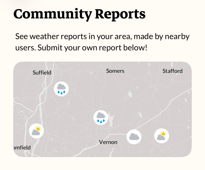 Another feature, Community Reports, lets users share information about their current conditions to improve the app’s real-time weather reporting.