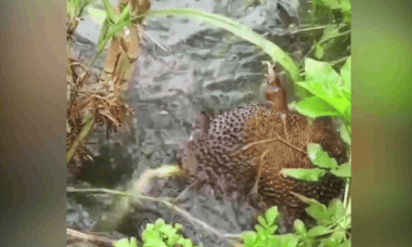 A ripe jackfruit tumbling into a pond turned into a free buffet, drawing a school of grass carp that swarmed in to devour it.