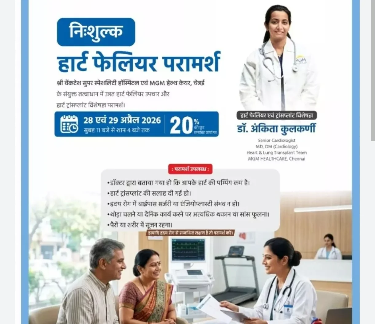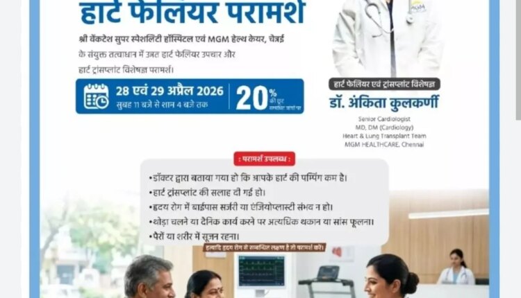 Chhattisgarh:- Under the joint aegis of Sri Venkatesh Superspeciality Hospital, Raipur and the country’s leading heart and lung transplant unit MGM Healthcare, Chennai, a free heart failure counseling camp is being organized on 28 and 29 April 2026 at Sri Venkatesh Superspeciality Hospital, Kamal Vihar, Raipur.