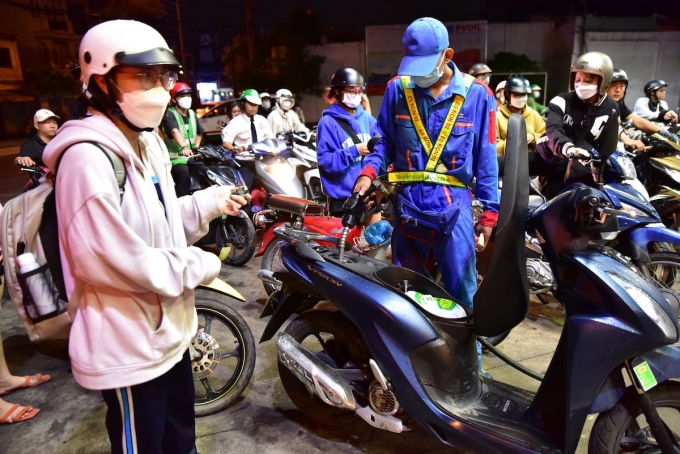 An employee refills a motorbike at a fuel station in HCMC in October 2022. Photo by VnExpress/Quynh Tran