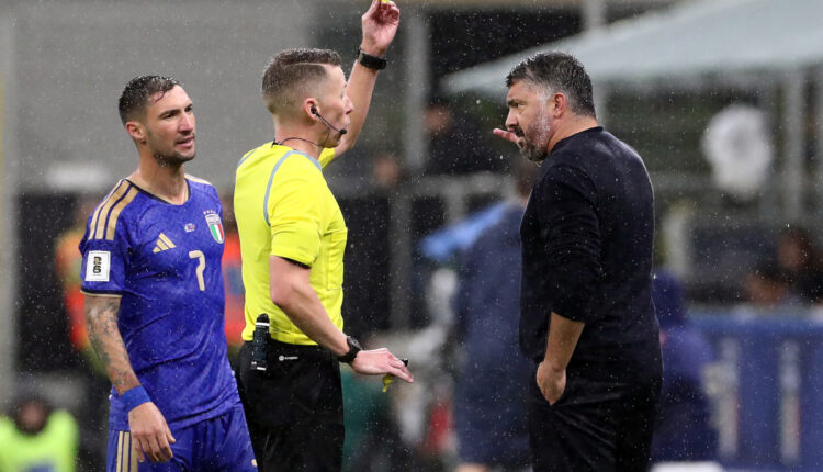 MILAN, ITALY – NOVEMBER 16: Referee, Alejandro Hernandez, shows a yellow card to Gennaro Gattuso, Head Coach of Italy, during the FIFA World Cup 2026 qualifier match between Italy and Norway at San Siro Stadium on November 16, 2025 in Milan, Italy. (Photo by Marco Luzzani/Getty Images)