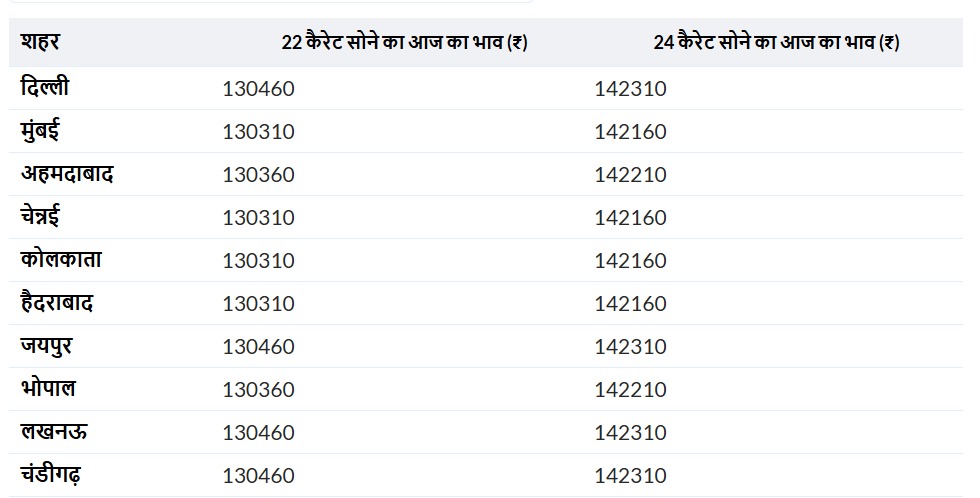 In both these cities, the price of 24 carat gold is Rs 142160 per 10 grams and the price of 22 carat gold is Rs 130310 per 10 grams.