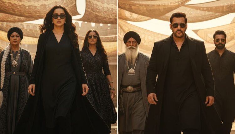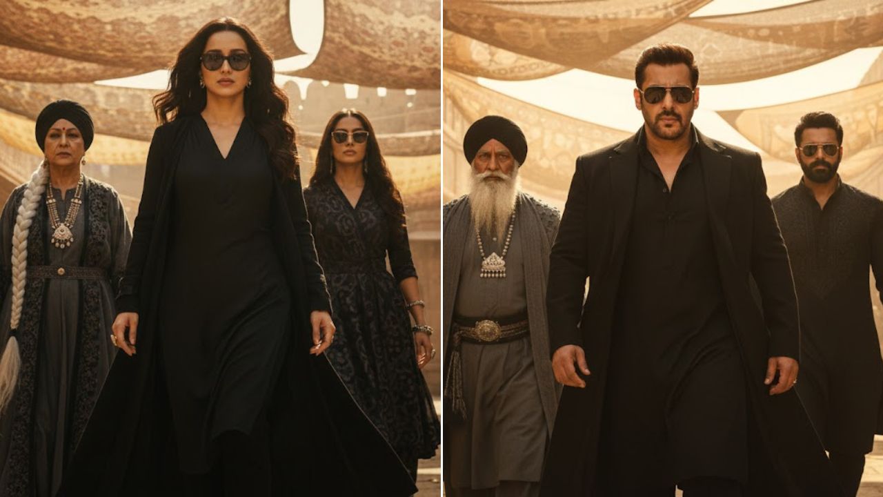 - Ultra realistic, cinematic full-body portrait of the same young woman from the reference photo (same hairstyle, defined eyebrows, neatly trimmed facial contours, and confident expression). A powerful cinematic scene showing a stylish female villain making an intense entrance. A sharp-featured woman wearing a black kurta-style outfit, black overcoat, and dark sunglasses walks forward with confidence. Warm golden sunlight filters through patterned fabric shades hanging overhead, creating dramatic light and shadow on her face. Behind her, two women follow one elderly with a long white braided hairstyle, black turban, layered gray robe, and heavy jewelry; the other younger with a confident look, dark glasses, and dark traditional and dark clothing. The environment resembles an ancient marketplace or desert fort made of sandstone, with textured walls and warm golden tones. The camera angle is slightly low, capturing a heroic, slow-motion walk. Highly detailed faces, crisp shadows, cinematic depth of field. (Photo Courtesy – AI Created)