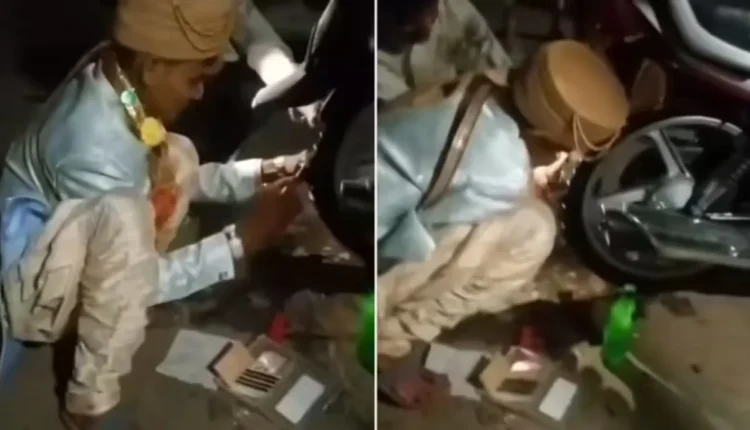Meanwhile, the groom sitting in the wedding procession passing by noticed the distressed son and his mother. Without any delay, the groom stopped his car and sat on the road in his wedding clothes and started repairing the bike.