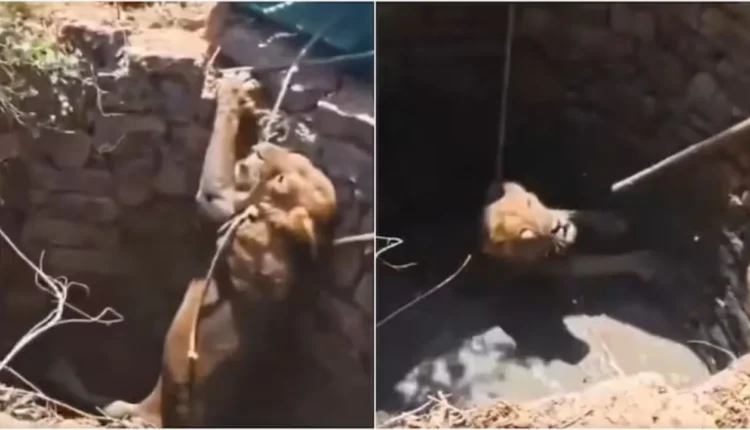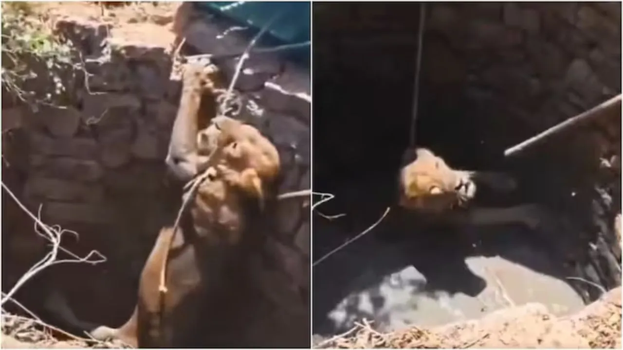 Rescue of a lion that fell into a well in Gujarat, pulled out safely after an hour of effort.