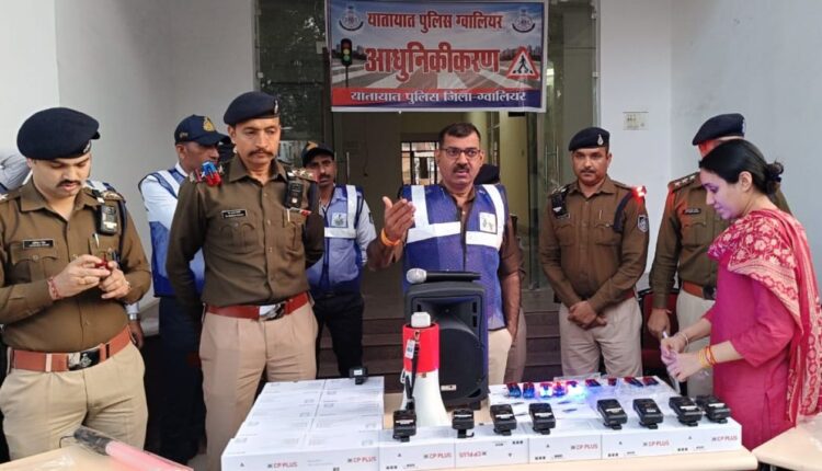 On the occasion of Holi, police personnel are currently deployed on the streets of Gwalior city equipped with safety equipment. To control the traffic, SP has fielded traffic policemen equipped with shoulder blinker lights, body worn cameras, light batons, recording PA system. SP Dharamveer Singh and Additional SP Anu Beniwal distributed this kit to the police personnel last evening.