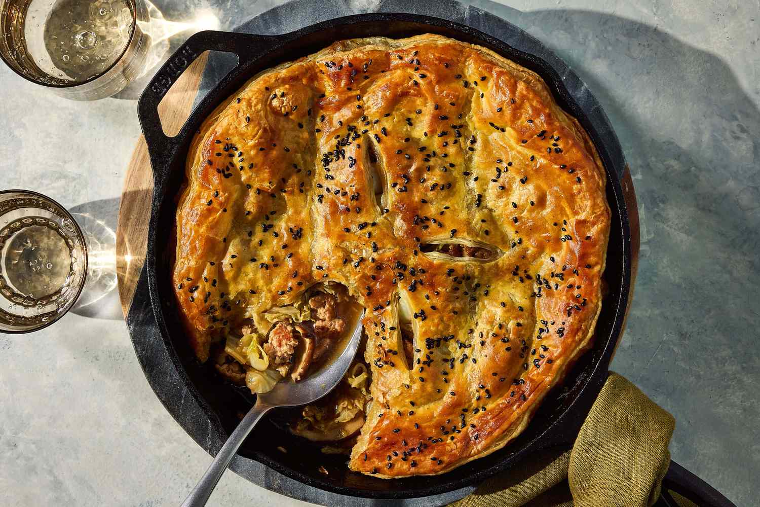 A single sheet of puff pastry replaces individual dumpling wrappers, creating a crisp, golden lid that seals in moisture while adding buttery contrast to the savory filling below. Freezing the pastry briefly before baking helps it puff dramatically in the hot oven, while small slits cut into the dough allow steam to escape and prevent sogginess. The final brush of egg wash and sprinkle of black sesame seeds echo classic gyoza toppings and add visual appeal.