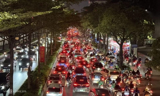 Xuan Thuy Street in Cau Giay Ward is clogged with vehicles at 9 p.m. on Feb. 8, 2026. Photo by Read/Nga Thanh