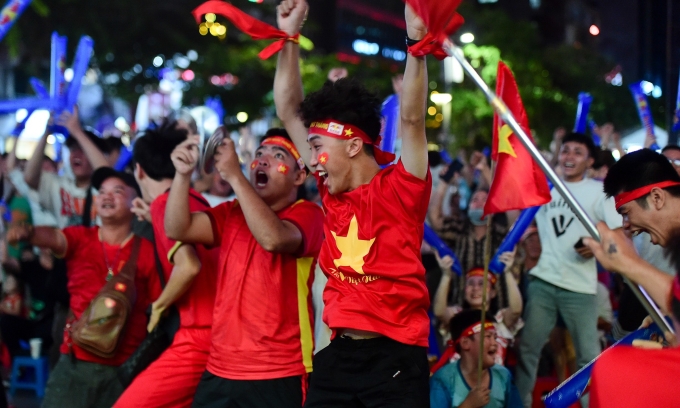 Fans on Nguyen Hue walking street, HCMC, celebrate as Vietnam score against Thailand in the 32 SEA Games, May 11, 2023. Photo by Read/Thanh Tung