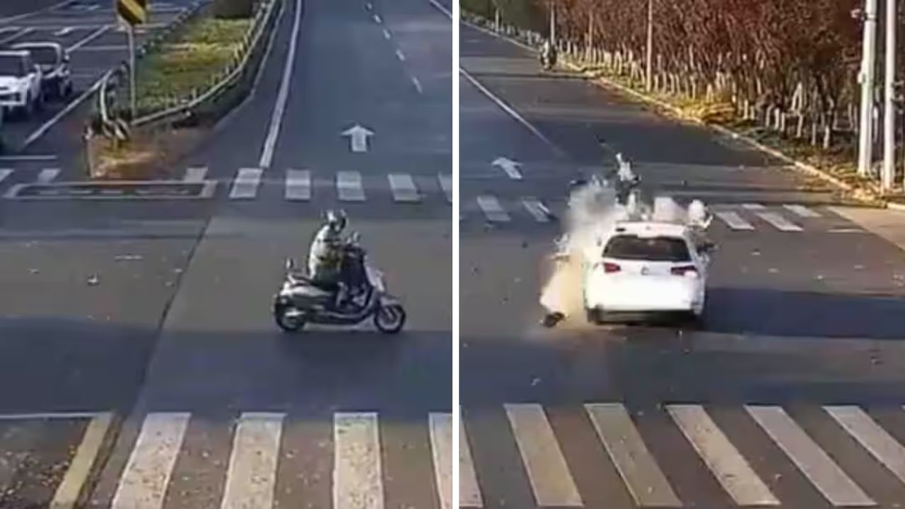 The collision is so severe that both the scooter and the driver are thrown several feet into the air. It is clearly visible in the video that the scooter’s wings fly away and the scooter rider goes away and falls on the road.