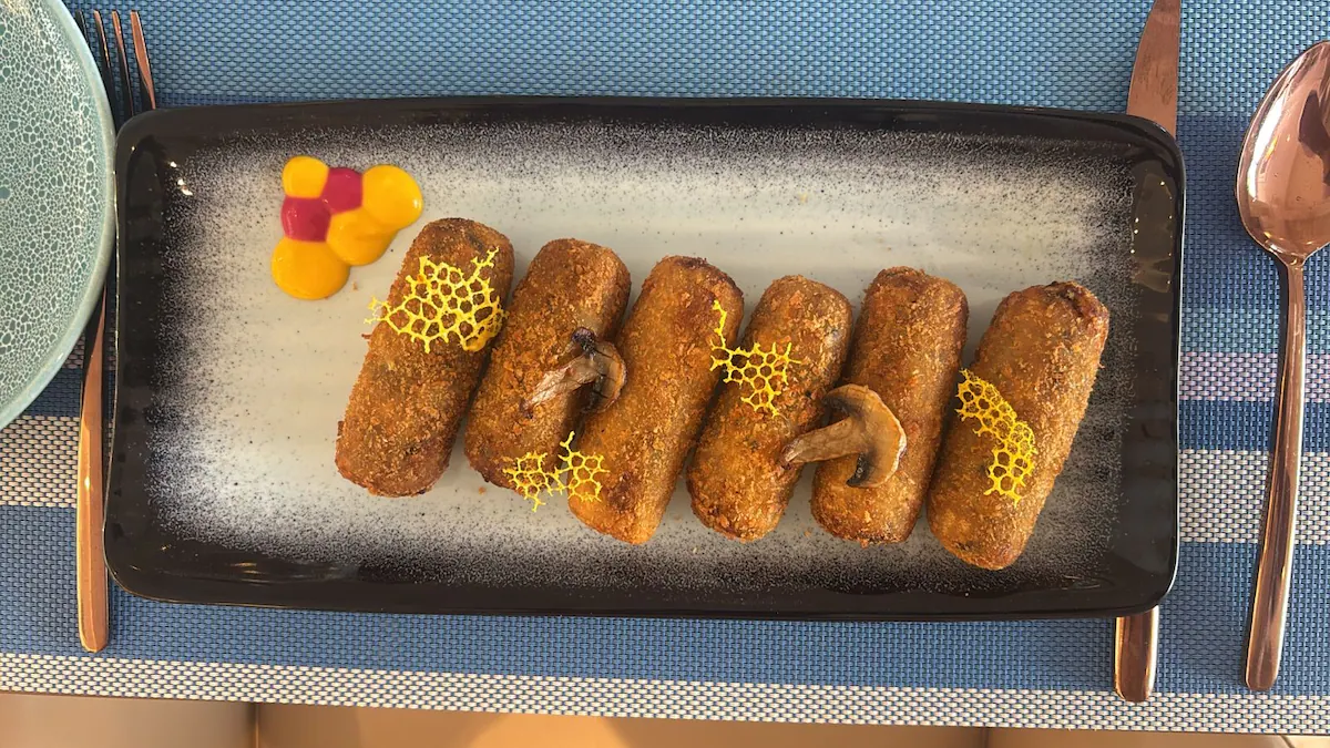 His Chattu Besera Croquettes reinterpret a rustic mushroom-mustard preparation. Mushrooms are marinated in yellow mustard, sauteed with onion, garlic, kasuri methi and spices, then shaped into croquettes and shallow fried – crisp outside, pungent and earthy within.