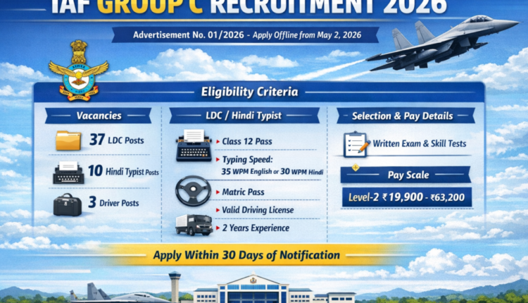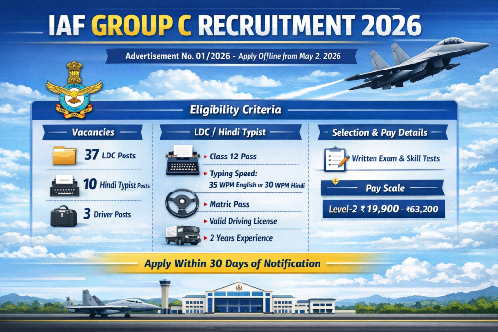 The Indian Air Force released its 2026 recruitment notification for Group C civilian posts under Advertisement No. 01/2026.
