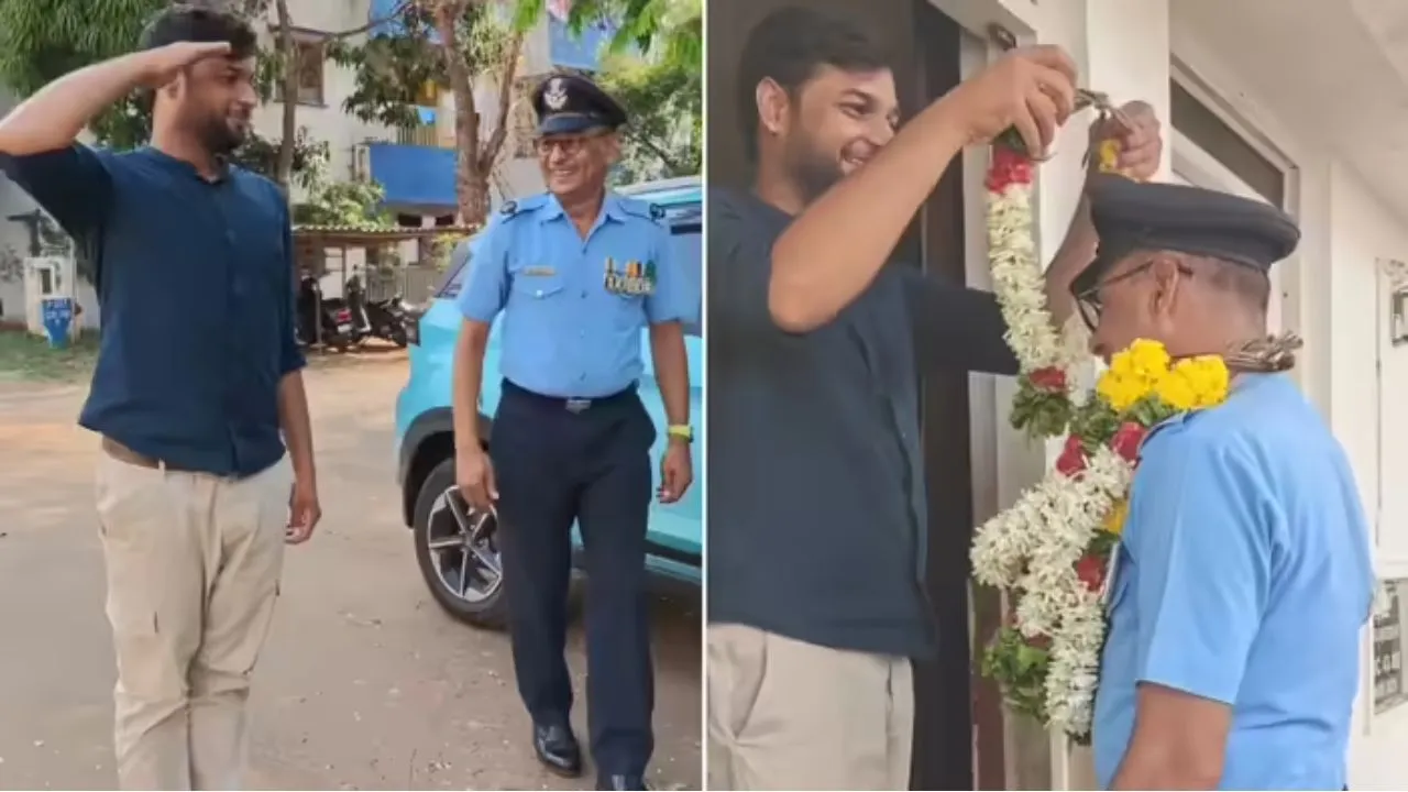 Son Salute IAF Retired Officer : Respect never ends for soldiers who serve the country, whether they are on duty or retired. One such emotional video is going viral on social media, in which a retired Indian Air Force (IAF) officer was welcomed by his family in a very special way. The special thing about this video is that no grand event was organized in it, rather this moment was made memorable in a small and simple way.