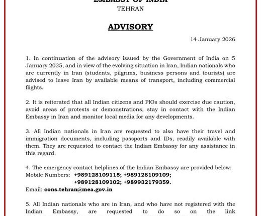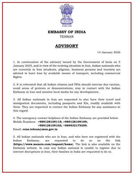 India’s advisory came amid rising tensions in Iran and the region after Trump indicated military action if Tehran continues its crackdown on the protesters.
