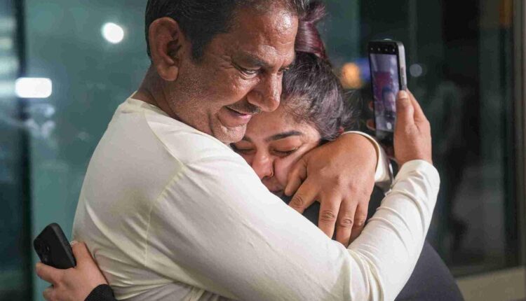An Indian passenger gets emotional while meeting family members after returning from Abu Dhabi at the IGI Airport, in New Delhi, on Monday, March 2. PTI Photo
