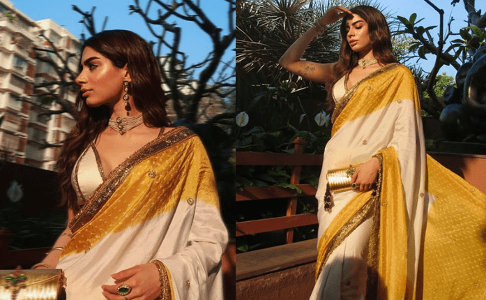 On this occasion, Khushi Kapoor wore a light and soft designed bandhani style saree Chuni, which had a beautiful blend of liveliness of yellow and peace of white. in his look Pearl Choker Necklace and Drop Earrings Simple makeup and open hair made this summer-themed style even more attractive.