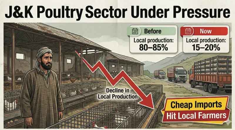 A poultry farmer from Shopian, who recently closed his unit after working for several years, said the business was no longer financially sustainable. “The cost of feed and other essential commodities has increased rapidly,” he said. “At the same time, the market is flooded with cheap poultry from outside. We were forced to sell below our production costs, and it was no longer profitable to continue the business.”