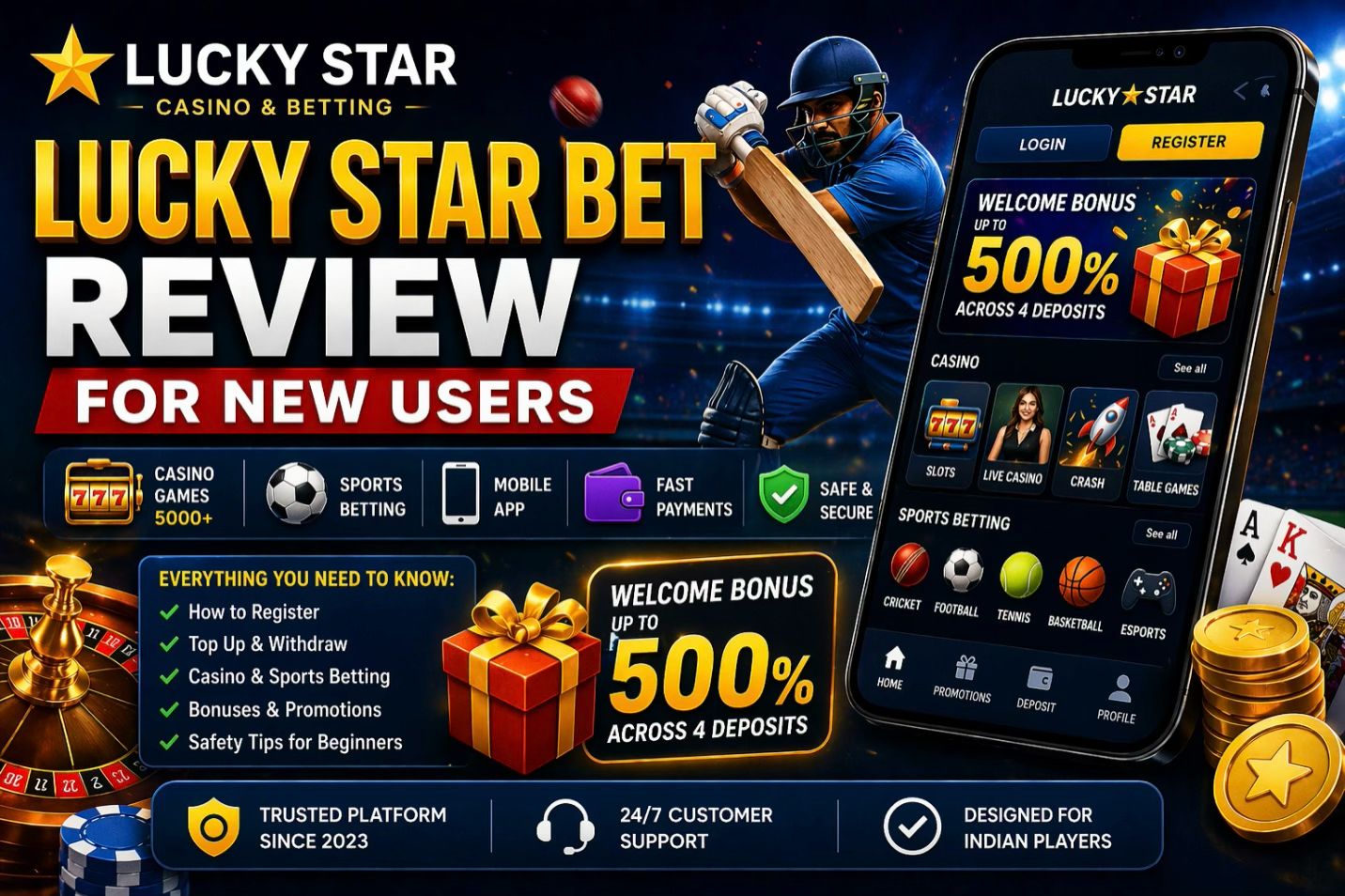 If you search for Lucky Star betyou usually want a simple answer: what the platform is, how it works, and what you should check before sending money. That is the right starting point. ๐ฏ Lucky Star presents itself as a combined casino and betting platform for Indian users, with one account that gives access to casino games, sports betting, esports, bonuses, payments, and mobile play. The homepage says the brand launched in 2023 and offers more than 5,000 games from over 50 providers, alongside sportsbook access for major sports such as cricket, football, tennis, and basketball.