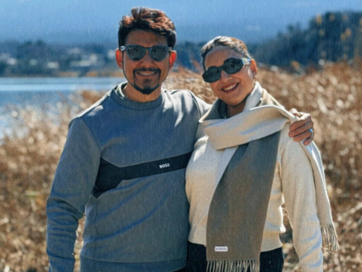 In the first photo, the couple stood close to each other and smiled, with Mount Fuji behind them. Madhuri wore a cream sweater, black pants and a scarf. She had her hair tied back and wore dark sunglasses. Shriram wore a grey sweater with matching trousers. They also shared a few solo pictures from the same spot.