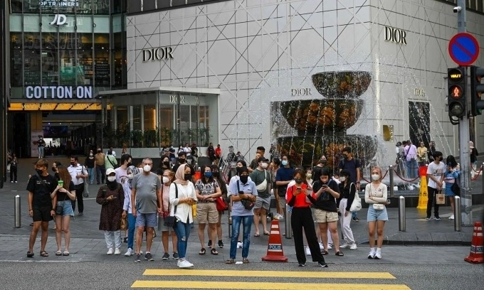 People wait before crossing a road in front of a shopping mall in Kuala Lumpur on June 2, 2022. Photo by AFP