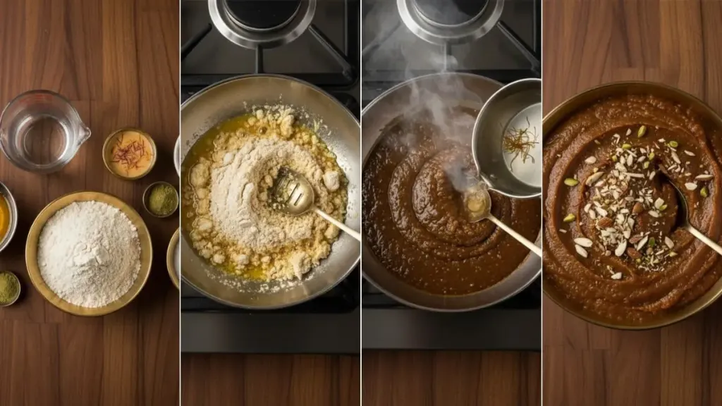 - This step is very important to make the halwa smooth and velvety. After adding the mixture, reduce the flame to medium and keep stirring it continuously. You will see that the flour will immediately start absorbing water and becoming thick. Keep stirring until the mixture becomes completely thick and starts leaving the sides of the pan.