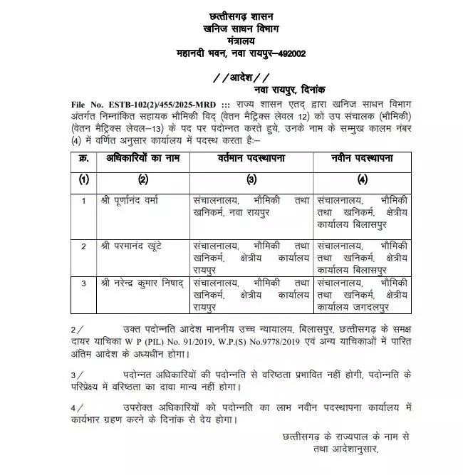 According to the order issued by the government, the promoted officers include Purnanand Verma, Parmanand Khunte and Narendra Kumar Nishad. According to the order, Purnanand Verma and Parmanand Khunte have been posted in the regional office of Directorate of Geology and Mining, Bilaspur. Narendra Kumar Nishad has been given new responsibility on the post of Deputy Director (Geology) in the Directorate of Geology and Mining, Regional Office, Jagdalpur.