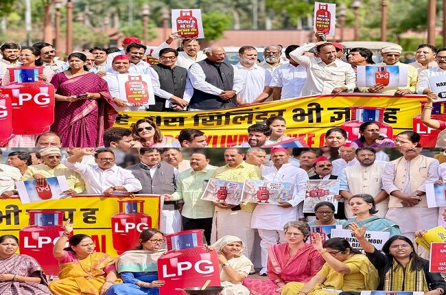 Raising the voice of millions suffering due to the nationwide LPG shortage, LoP Shri @RahulGandhialong with other Opposition leaders, staged a protest in the Parliament premises.