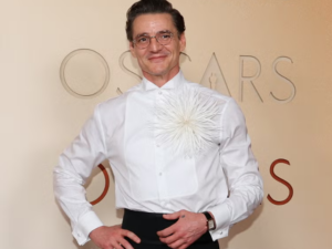 He is also spotted at the 2026 Academy Awards wearing a custom Chanel look, including a jacketless white tuxedo shirt, floral brooch, high-waisted black trousers and a Chanel watch.