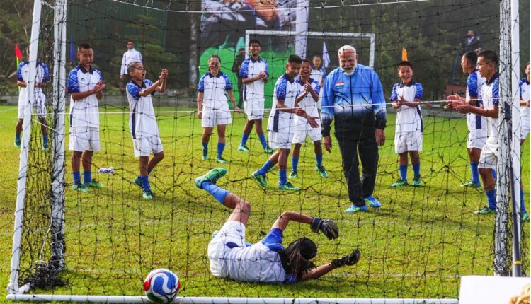 Prime Minister Narendra Modi plays football with youngsters during an interaction session in Gangtok on Tuesday. Photo: IANS