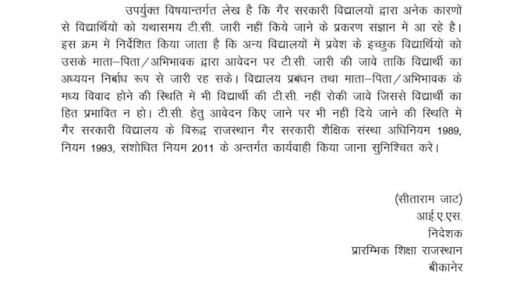 Keeping in mind the interests of students studying in non-government schools, an important and effective instruction has been issued by the Rajasthan Education Department. In this order issued by Director, Elementary Education Shri Sitaram Jat (IAS), it has been made clear that it will be mandatory for all non-government schools to issue Transfer Certificate (TC) to the students on time.