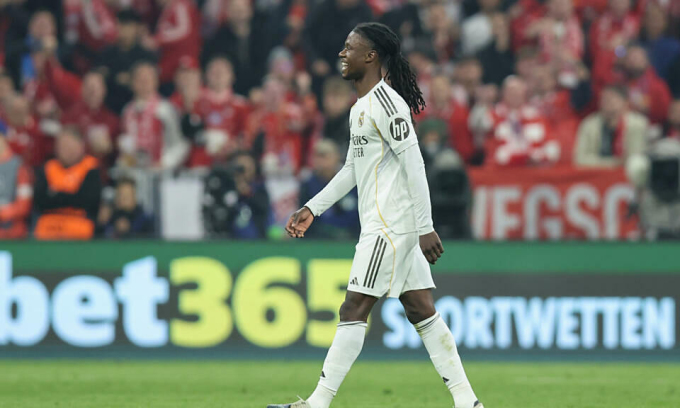 Real Madrid midfielder Eduardo Camavinga was sent off in Wednesday’s loss to Bayern Munich. Photo by AFP