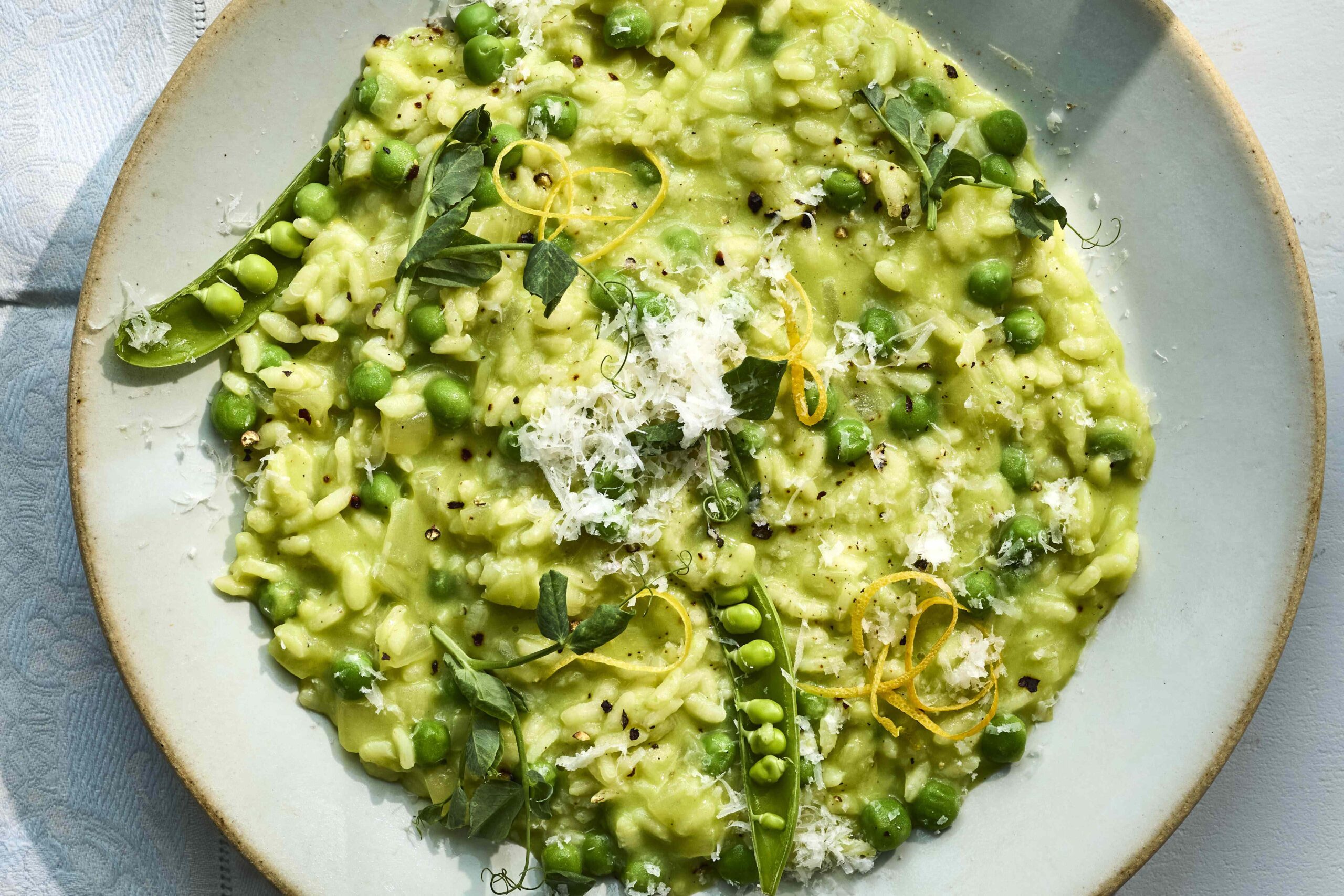 This dish offers a delicate balance of sweet peas, creamy rice, savory cheese, and bright citrus notes, making it both comforting and refreshing.