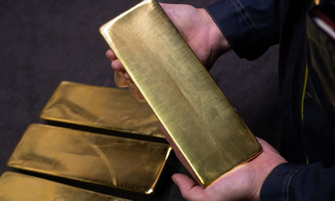 An employees shows an ingot of 99.99% pure gold at Novosibirsk Refining Plant in Novosibirsk, Russia on September 15, 2023. Photo by Anadolu via AFP |