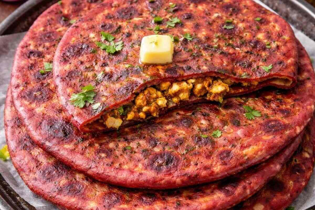 This is the best method for kids who don’t want to eat vegetables. Mix wheat flour with kora beet, jawan, green chillies and salt. A beautiful deep pink colored soft paratha is made by brushing with little ghee. A great combination of health and taste.
