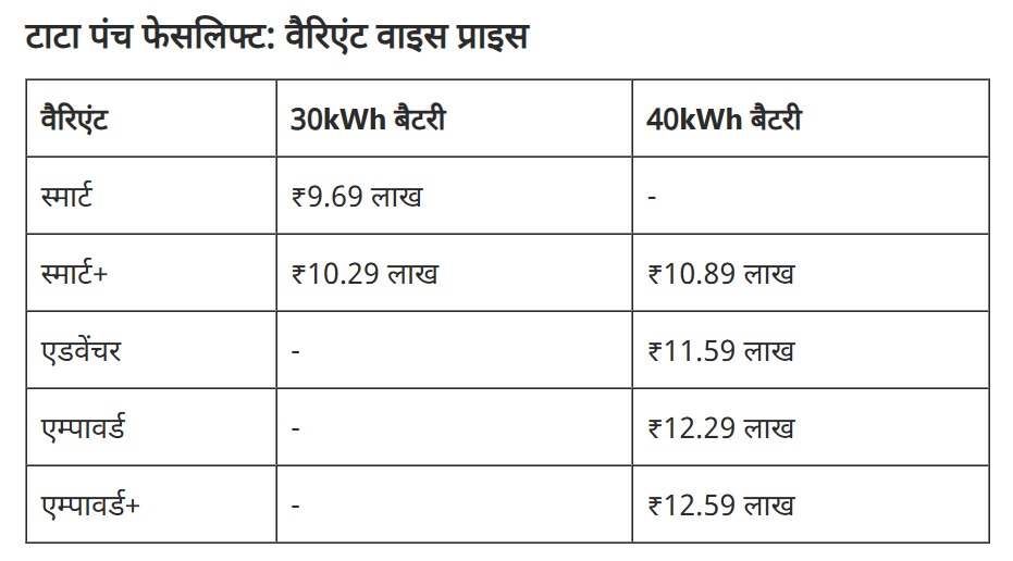 Prices start at ₹9.69 lakh, going up to ₹12.59 lakh for the top variant. Tata has introduced the new Punch EV in five trim levels. These include Smart, Smart+, Adventure, Empowered, and Empowered+. The new base variant of the electric car is Rs 30,000 cheaper than the old model, while the top variant with a bigger battery is now cheaper by Rs 1.85 lakh. Booking of the car has started, and deliveries will start soon.